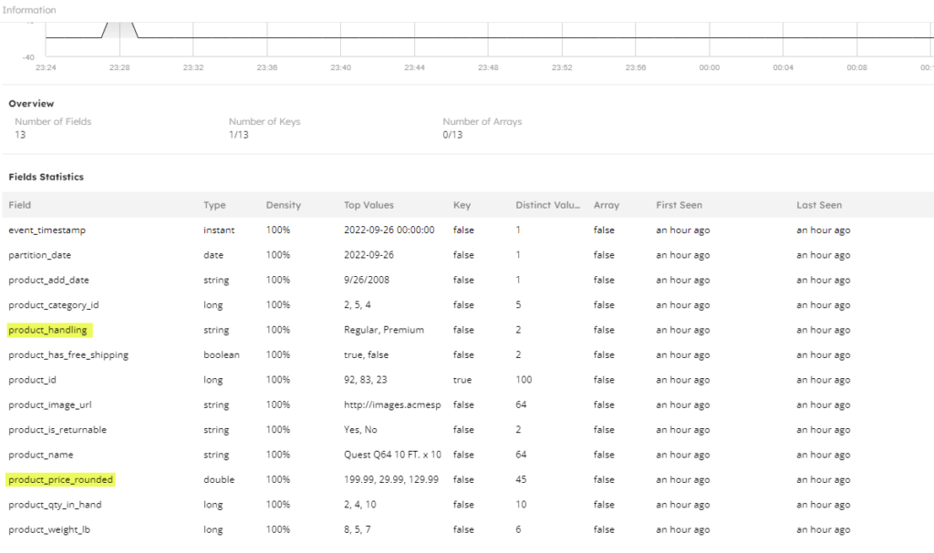 The information panel exposes details about the volume and rate of events ingested into the table. It also enables you to inspect column names, types, and top values in each. If you created a table using a primary key, the key column also displays to make it easy for you to know how to join with this table. Finally, the First Seen and Last Seen columns reveal when columns were added or removed.