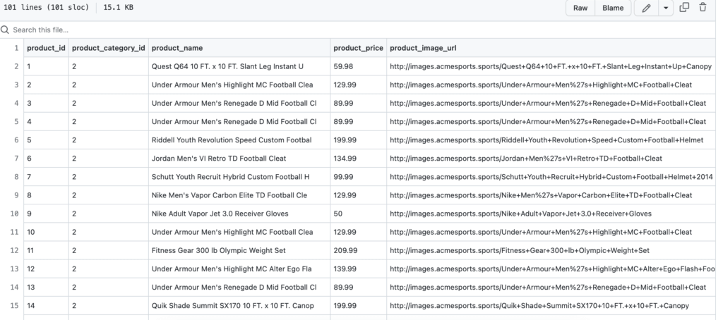 Assume we have a source that ingests data.csv files into Amazon S3 to hold product information. This sample dataset contains this schema: