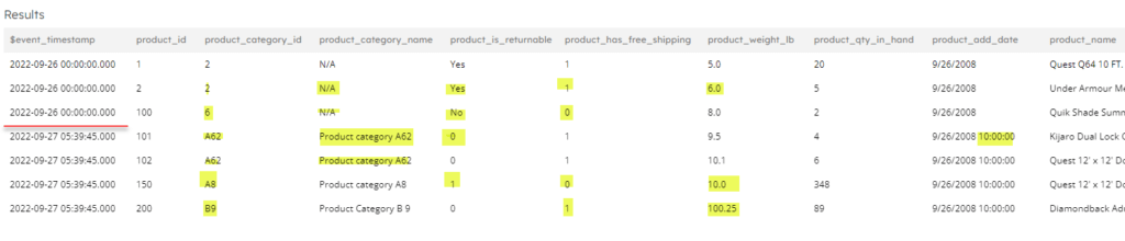 - Ingests the new product_category_name column. Previous product records will have N/A for this new column and new records will have the correct value. First seen metrics will show this attribute was added recently.