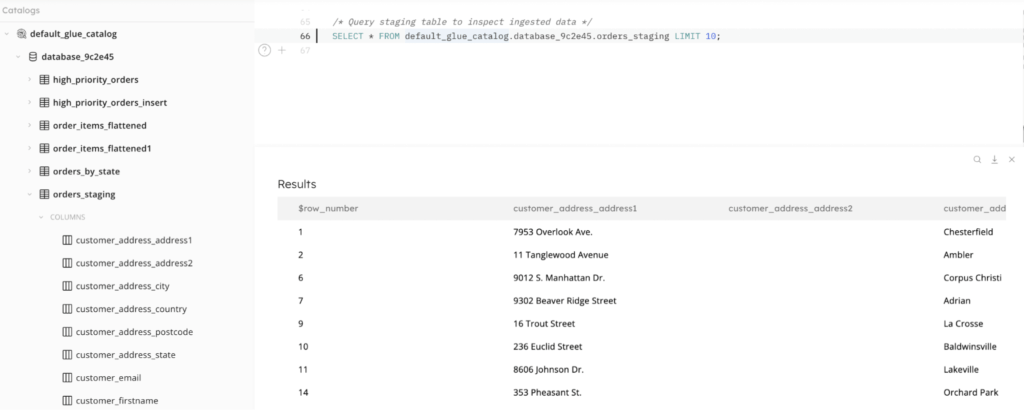 And you can go beyond monitoring the job to querying the staging tables. Because SQLake creates metadata catalog entries for your staging tables and partitions the incoming data, it can be efficiently queried from within a SQLake worksheet. Inspecting the data you’ve ingested is as simple as writing a SELECT statement against the staging table, as you can see in the screenshot below.