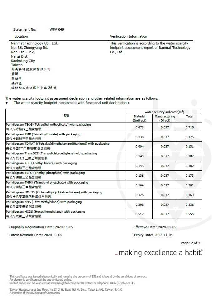 獲頒英國標準協會台灣分公司 BSI ISO14046:2014 水足跡認證-2020/11/05