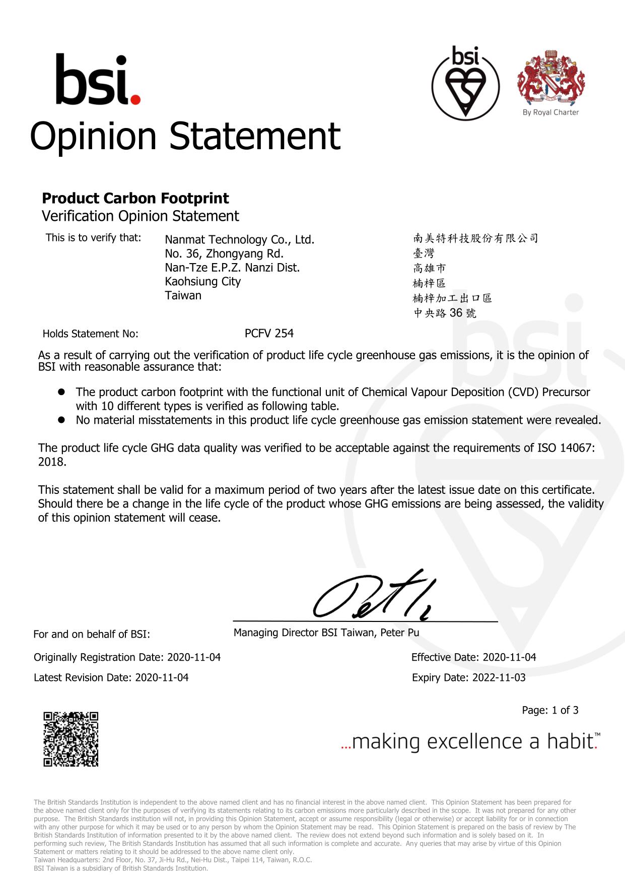 獲頒英國標準協會台灣分公司 BSI ISO 14067:2018 碳足跡認證-2020/11/04