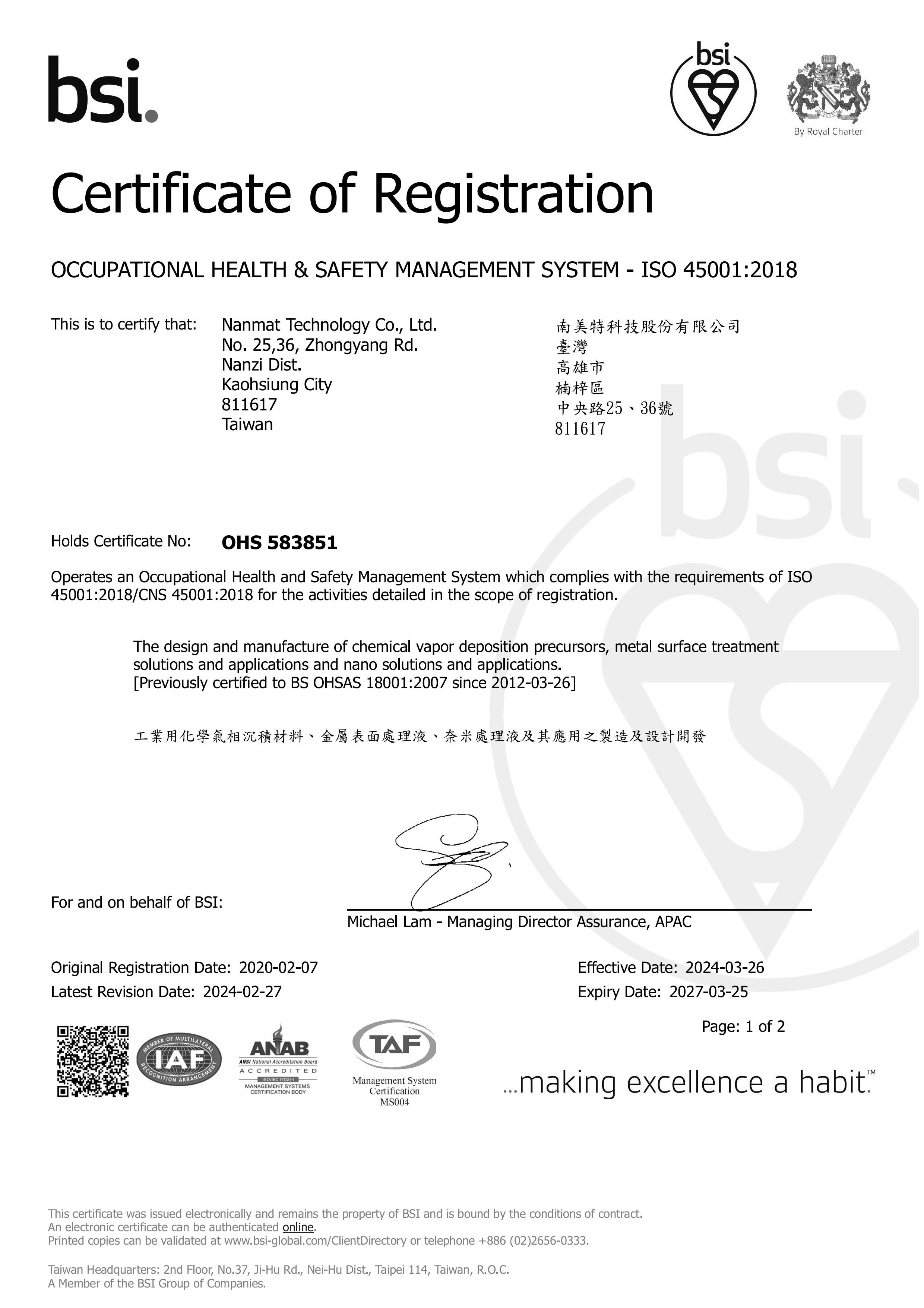 獲頒英國標準協會台灣分公司 BSI ISO45001:2018 認證-2024/03/26