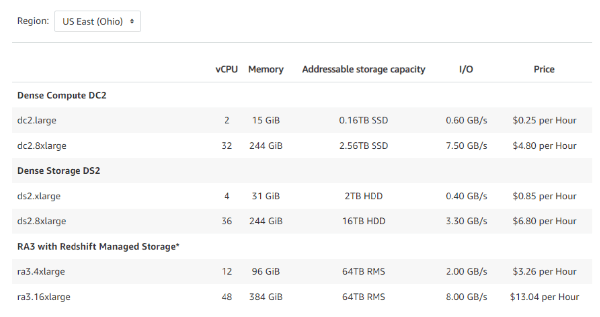More details on AWS Redshift pricing and cluster configuration can be found here.