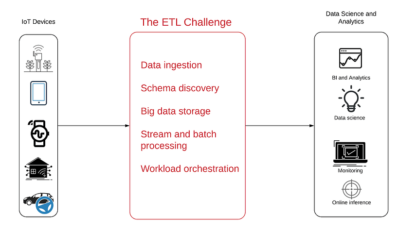 However, to reach that goal, data must first be transformed from its raw streaming form into analytics-ready tables that can be queried using SQL and familiar analytics tools. This is the process of extract-transform-load (ETL), which is frequently the most complex part of analytics projects – and especially so in light of the following: