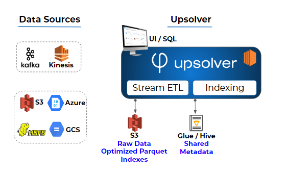 Upsolver automates ingestion by natively connecting to event streams (Apache Kafka or Amazon Kinesis) or existing object storage, stores a raw copy of the data for lineage and replay, along with consumption-ready Parquet data – including automatic partitioning, compaction and compression. Once data is on S3, Upsolver offers industry-leading integration with the Glue Data Catalog, making your data instantly available in query engines such as Athena, Presto, Qubole or Spark.