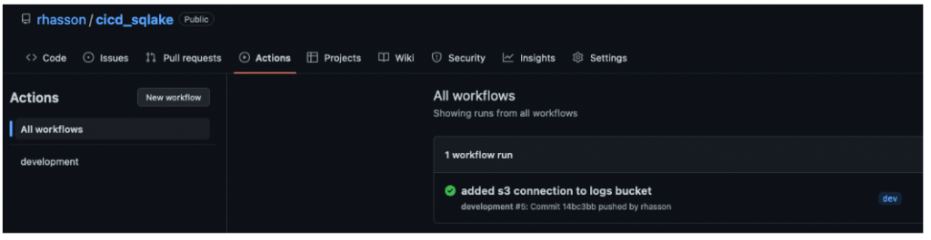 Commit and push the changes to your dev branch. Look in the Actions tab of your repo view successful workflow executions. In my case, I pushed the schema change first and then the job, so I have two different workflows in the screenshot below: