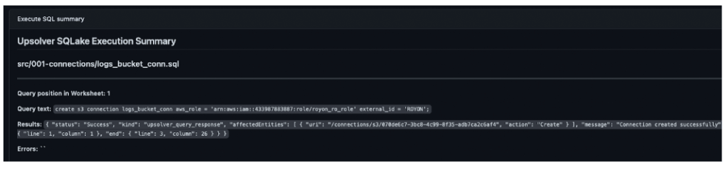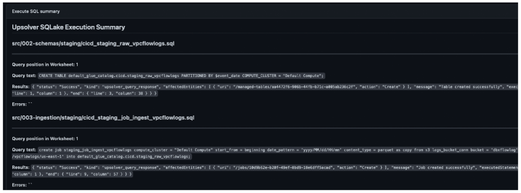 Save the files, push to your dev branch on Github, and let the Github Action deploy the changes to your SQLake development environment. When the action completes you can inspect the Summary output, which should look similar to the following: