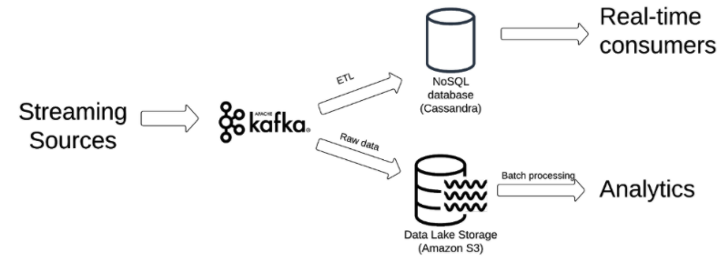 The traditional solution to this lack of indexing is to add a NoSQL database that will serve as the real-time key value store. As data is being ingested into the lake, the relevant key-value pairs will also be written to our NoSQL instance. Aggregations and joins are done in this database, and the results are served from there to applications that require data. Cassandra is the ‘go to’ open-source solution, while Redis and DynamoDB are also popular alternatives.