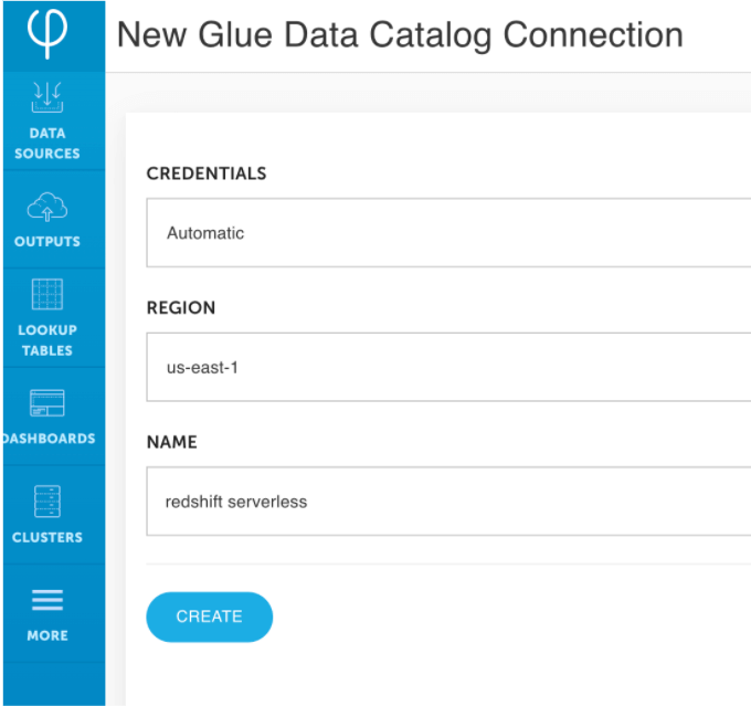 1. In the Upsolver console, click More and then click Connections. Scroll down and select the AWS Glue Data Catalog connection. For Region, enter your region. For Name, enter a descriptive name. For this post, we call it redshift_serverless. Then click Create.