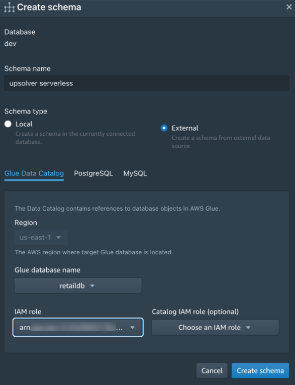 5. When the endpoint launches, open the new Amazon Redshift query editor to create an external schema that points to the AWS Glue Data Catalog (see the screenshot below). This enables you to execute queries against data stored in your data lake.