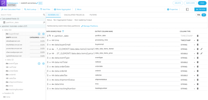 3. Map data source fields to the Redshift Spectrum output. Then, in the upper-right corner of the screen, click Run.