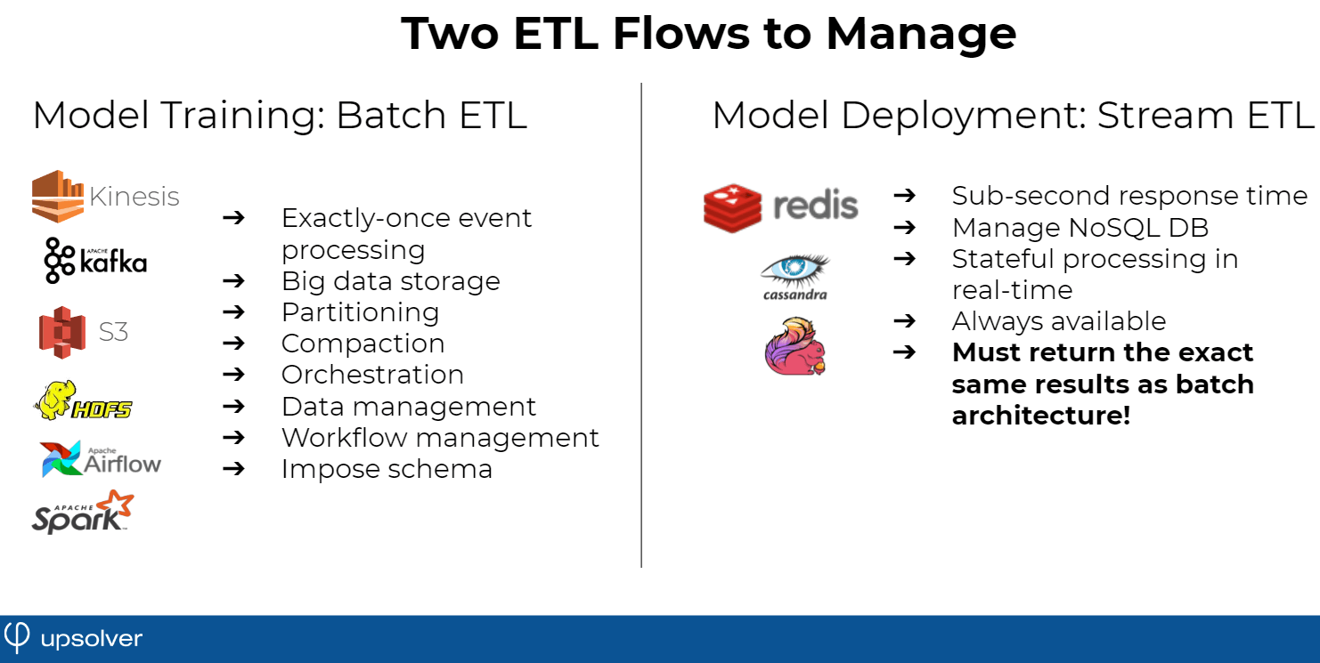 In the batch ETL model training layer, you need to worry about processes such as exactly-once event processing, compaction, big data, storage, partitioning on S3 – all of which need to be done right if you want reasonable performance at reasonable cloud costs.