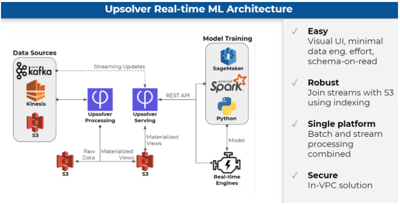 In Upsolver we focus on the online portion – the entire platform is built on a streaming framework, so that the offline is just running the streaming framework faster. This eliminates all of the manual coding, removes the data plumbing and almost all of the DevOps work, and essentially gives the data scientist the ability to define their dataset using streaming production code.