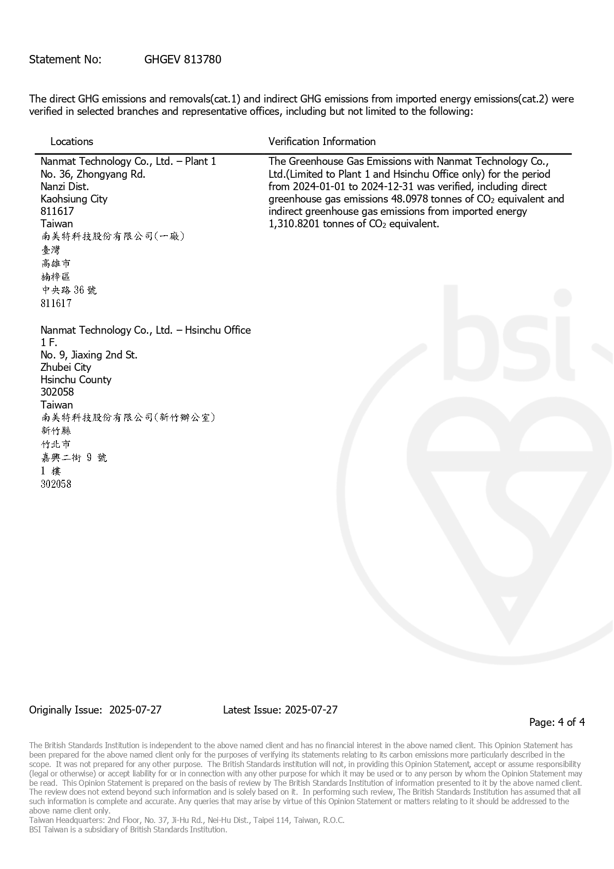 獲頒英國標準協會台灣分公司BSI ISO 14064-3:2019 溫室氣體查證-2025/07/27