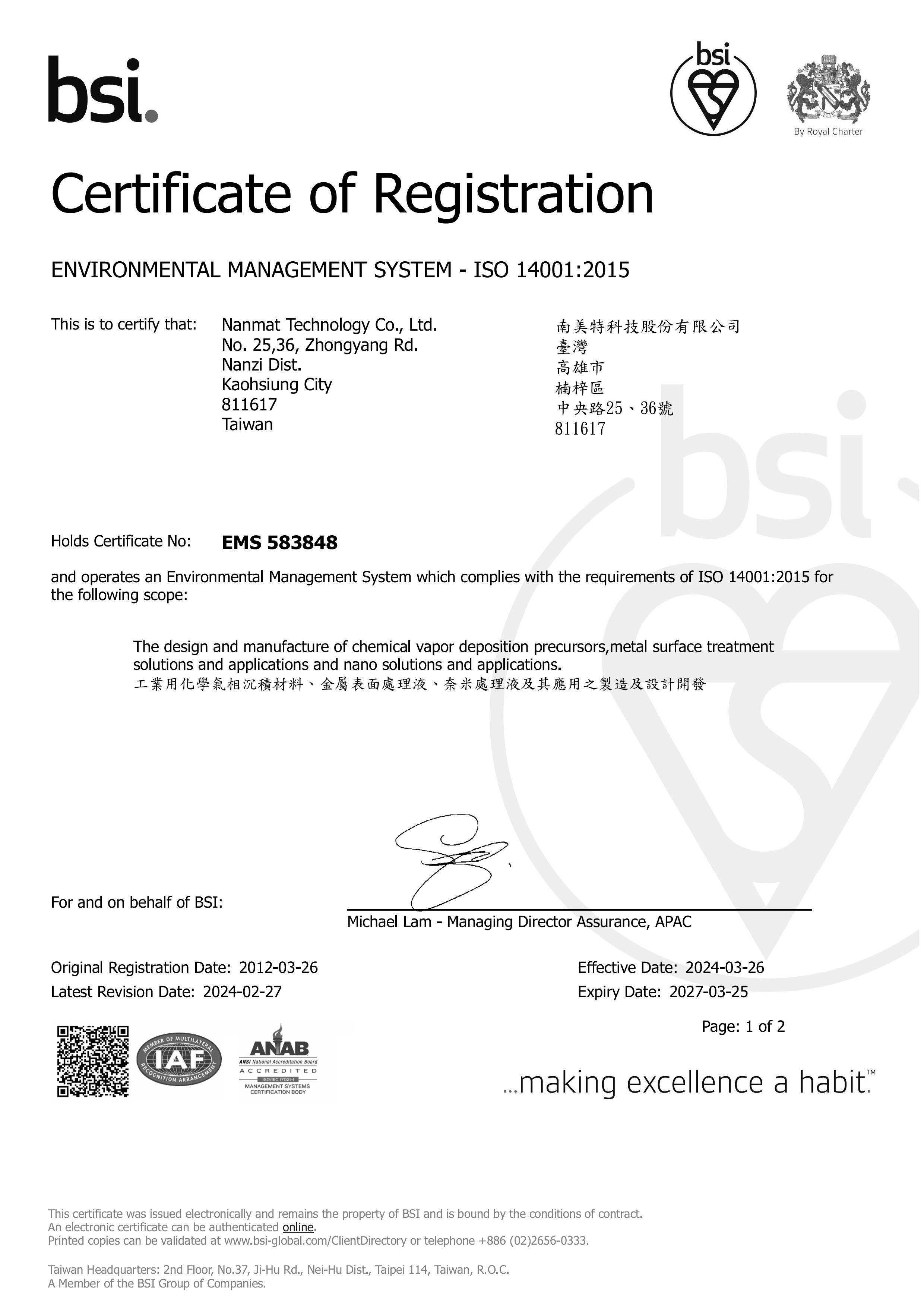 獲頒英國標準協會台灣分公司 BSI ISO14001:2015 認證-2024/03/26